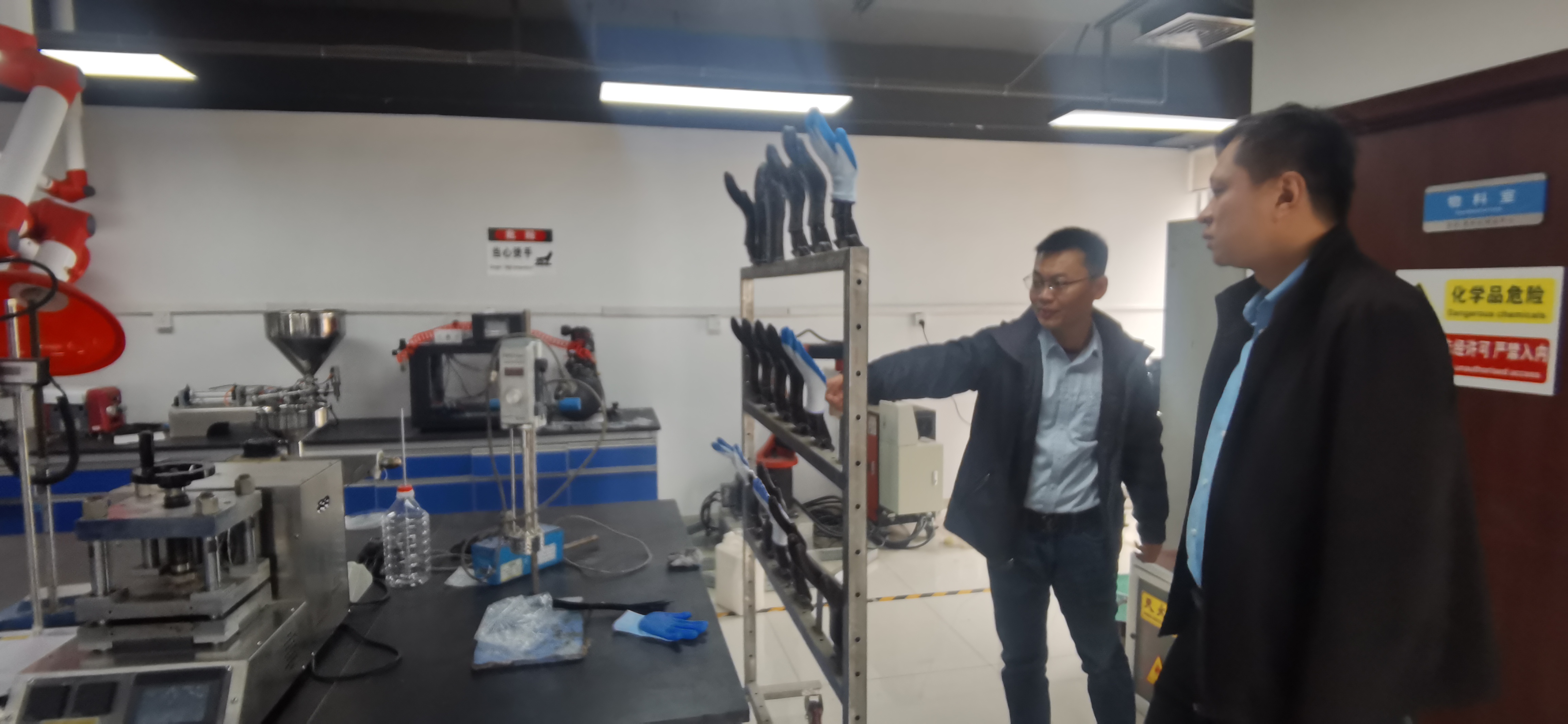 张彬一行参观了橡塑与工程重点实验室以及青科大星宇手套研发中心,就项目合作所需要的理化性能检测及分析条件进行了充分的了解。对我校的的科研条件及水平给予了高度肯定。
